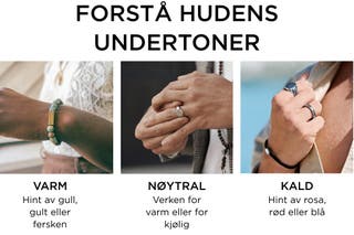 Det er tre hovedtyper: varm, kald, og nøytral. Varme undertoner har hint av gull, gult eller fersken. Kalde toner heller mer mot rosa, rød eller blåaktige nyanser. Nøytral? Et sted midt imellom, verken for varm eller for kald.