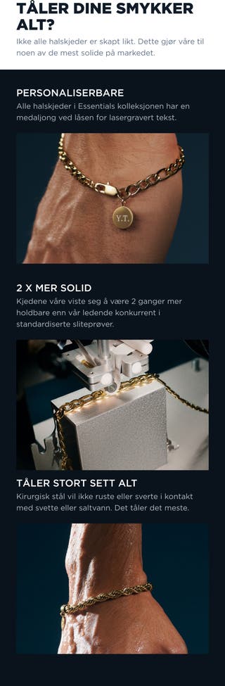 Dette armbåndet er laget av 316L rustfritt stål med en varm gullfinish. Det har en raffinert kjedeprofil og en pen karabinlås. Rundede ledd sitter tett og danner en jevn flate som fanger lyset diskret. Rene linjer og lav profil gir et moderne, nedtonet uttrykk.