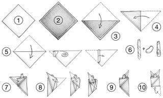 - Brett det første lommetørkleet dobbelt diagonalt, og rull sammen.