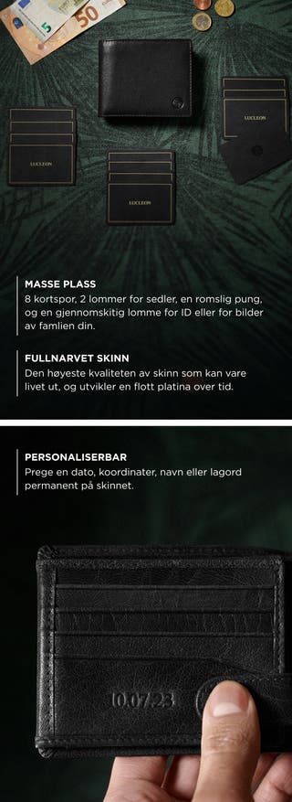 - Rommer opptil 20 kort, kontanter og kvitteringer