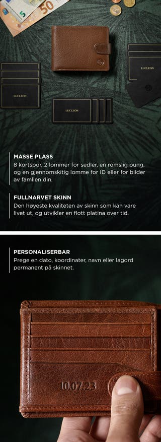 - Ekte skinn: Holdbart ekte skinn tåler daglig bruk og gjør at lommeboken beholder utseendet over tid.