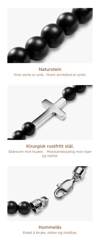 Polerte svarte onyxperler og 316L rustfritt stål gir armbåndet et rent og moderne uttrykk. Et horisontalt kors i rustfritt stål er plassert mellom perlene som et diskret midtstykke. De glatte overflatene på både stein og metall gir et raffinert inntrykk.